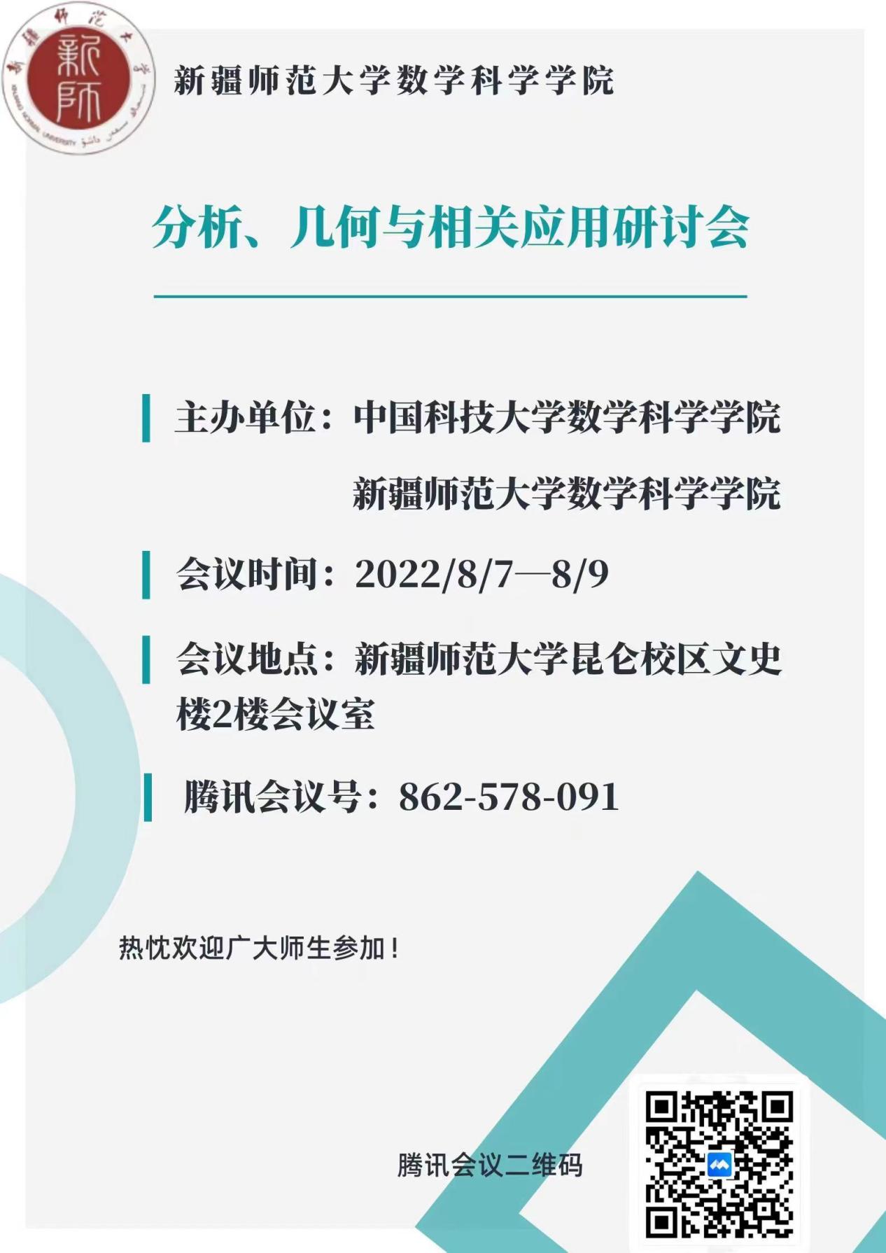 西部大开发战略为新疆带来了历史性机遇。近年来,新疆的科技和教育等各项事业快速发展。为了进一步推动我国数学领域相关学科的研究,不断深化与新疆高校间的合作,持续助力西部大开发,定于2022年8月6日至8月11日在新疆师范大学举办“分析、几何与相关应用--中科大、新疆师大联合会议”。 会议期间,与会专家学者将共同探讨本领域的前沿热点及发展方向,并就共同关心的其它相关问题进行交流研讨。